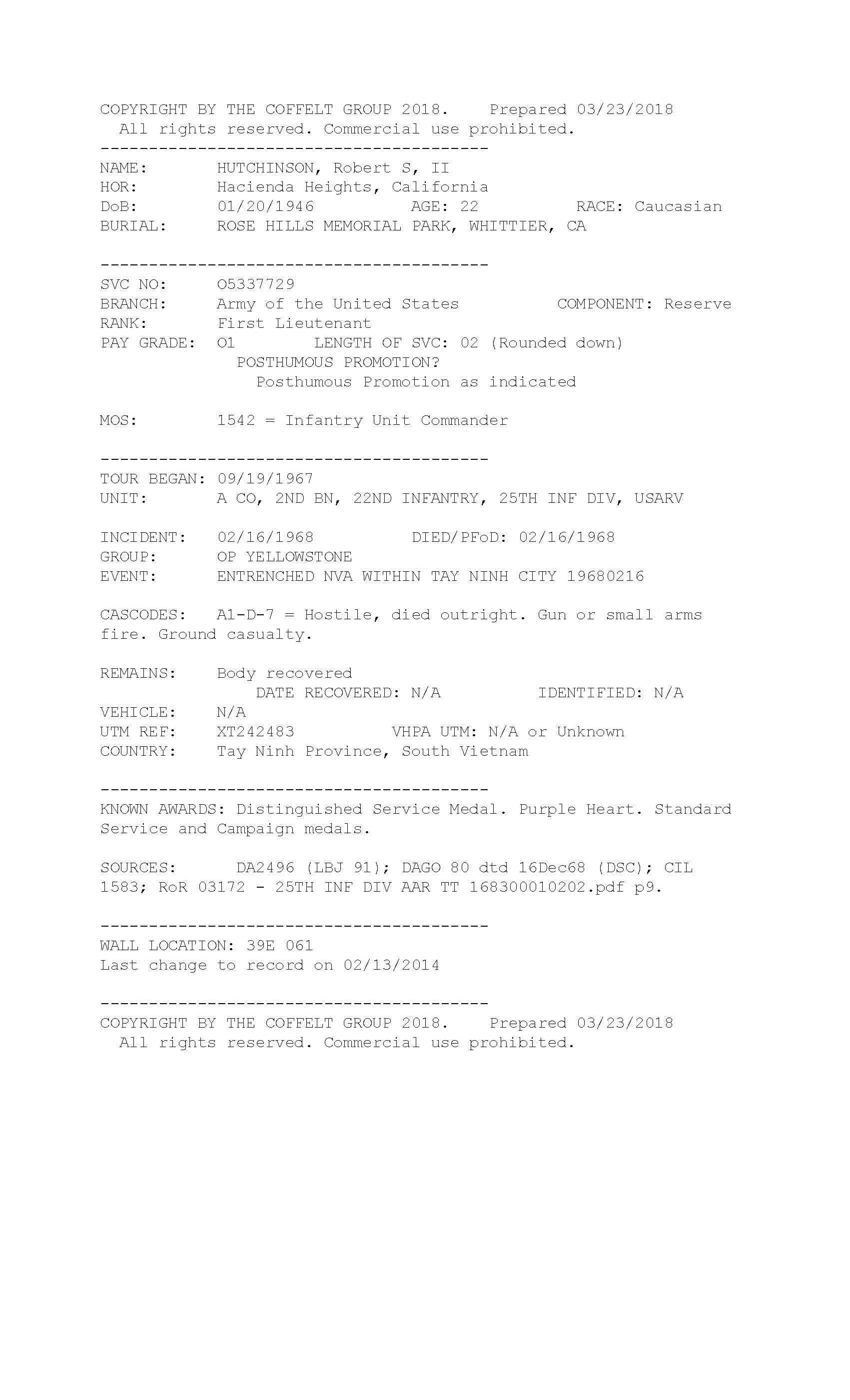 The President of the United States takes pride in presenting the Distinguished Service Cross (Posthumously) to Robert S. Hutchinson, II (0-5337729), First Lieutenant (Infantry), U.S. Army, for extraordinary heroism in action on 16 February 1968 while serving with Company A, 2d Battalion (Mechanized), 22d Infantry, 25th Infantry Division in the Republic of Vietnam. On this date, elements of Company A were conducting a reconnaissance-in-force operation in the vicinity of Tay Ninh when Lieutenant Hutchinson's platoon came under attack by antitank rockets, rifle grenades, automatic weapons and small arms fire from a Viet Cong battalion positioned in well-fortified bunkers. Without hesitation, he immediately began directing the fire of his men on the enemy, and, after an armored personnel carrier had crashed through a brick wall in front of the enemy positions, he led his men through the opening in an assault against the insurgents. When heavy casualties were sustained, Lieutenant Hutchinson withdrew his men to regroup, covering their movement with his own fire. As the Viet Cong began a counterassault, he remained in his exposed position and fired into the charging Viet Cong ranks. Even though an enemy rocket exploded near him, Lieutenant Hutchinson continued to hold his position until his men had cleared the area. After supervising evacuation of the wounded, he again reorganized his men for another assault on the Viet Cong positions. While closing on the enemy, he was mortally wounded by automatic weapons fire. His courageous actions and determination were responsible for the eventual defeat of the fanatical enemy force. Lieutenant Hutchinson's extraordinary heroism was in keeping with the highest traditions of the military service and reflects great credit upon himself, his unit and the United States Army.