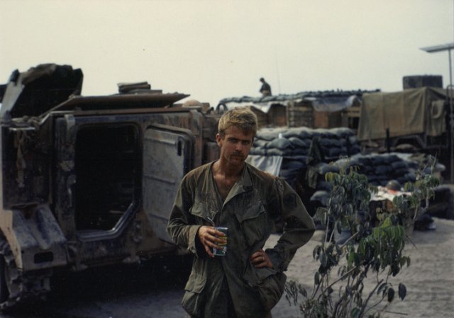 This was typical daily dress. Standard jungle fatiques .I always wore long sleeves to keep the sun off. Notice how dirty we were. The APC's were aways rolling on red clay roads during the dry season and of course it kicked up from the tracks in the lead and we drove thru it. The only dust protection we had was a bandana/handkerchief. No goggles were issued. I carried an M60 with a 50 round starter built and 2 or 3 hundred round 7.62 belts. Always wore steel pots, and "sometimes" wore flack jackets when track mounted.