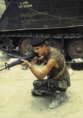 Typical "Hard Core" posed picture to send home. I used an M16 rarely, and typically only on a listening post assignment at night. On ambush patrols I carried my regular M60. The tiger suit was sold by some mamasan on our road clearing route. I did wear the dagger located on my left leg all the time. Easier than carrying a 1911 with my M60. The vest I made by tearing out sleeves and then sewing on two 7 pocket empty 5.56 bandoliers. After the picture I gave the vest to Jimmy Robinson who used it a lot.