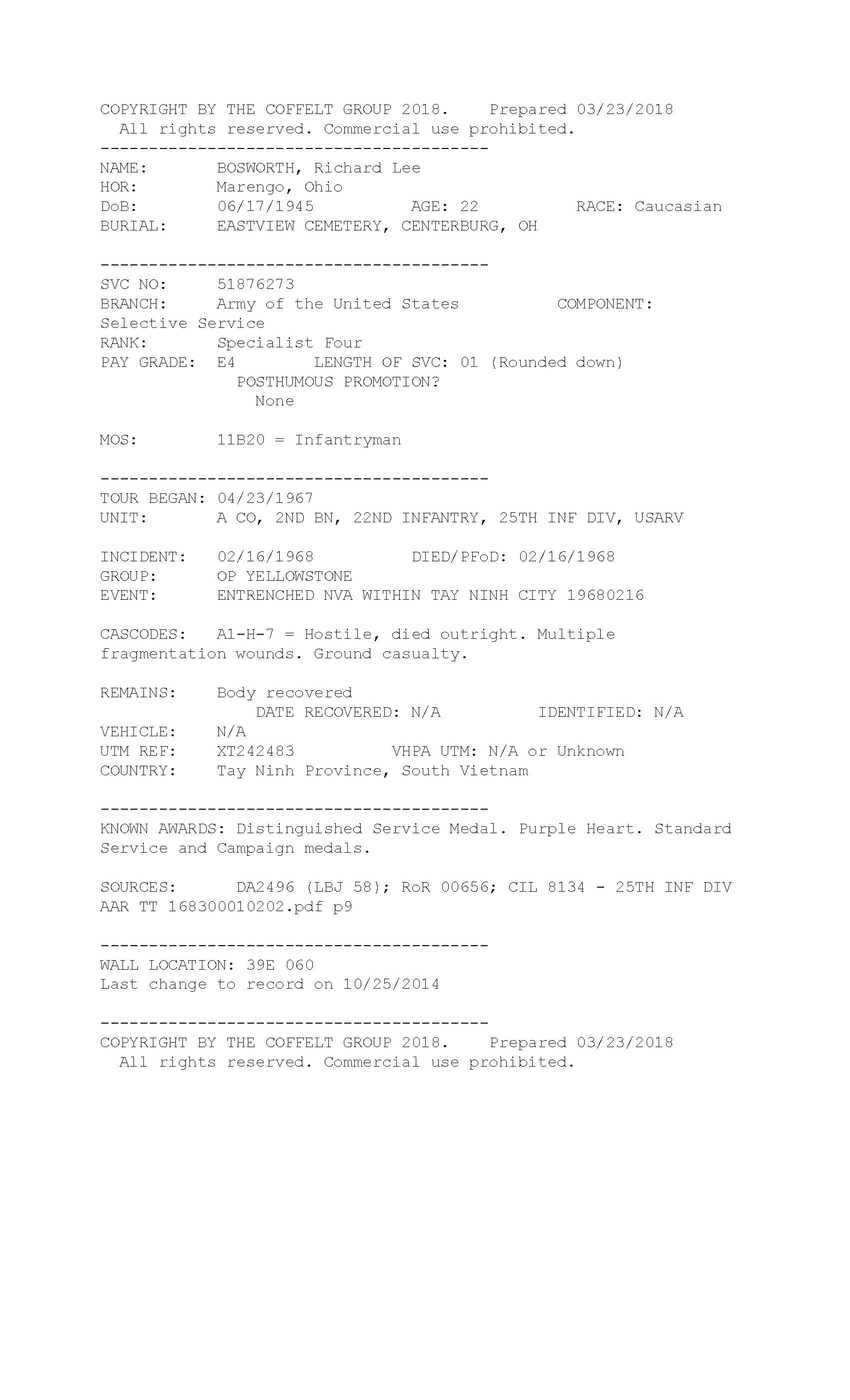 The President of the United States takes pride in presenting the Distinguished Service Cross (Posthumously) to Richard Lee Bosworth (US51876273), Specialist Fourth Class, U.S. Army, for extraordinary heroism in action on 16 February 1968 while serving with Company A, 2d Battalion (Mechanized), 22d Infantry, 25th Infantry Division in the Republic of Vietnam. On this date, elements of Company A were conducting a reconnaissance-in-force operation in the vicinity of Tay Ninh. As the lead platoon moved into the outskirts of the city and approached a brick wall, it came under attack by antitank rockets, rifle grenades, automatic weapons and small arms fire from an estimated battalion of Viet Cong concealed in well-fortified bunkers. As Specialist Bosworth was positioning his armored personnel carrier for an assault on the enemy positions, the vehicle was struck and disabled by an antitank rocket and he was severely wounded. Completely disregarding his own painful wounds, Specialist Bosworth assisted in the evacuation of the other casualties. Moving through a heavy volume of enemy fire, he climbed aboard another armored vehicle and was positioning it for an attack on the Viet Cong when a grenade exploded on top of the vehicle, wounding him a second time and knocking him from the vehicle. Undaunted by the pain of his wounds and ignoring the fierce fighting raging around him, he obtained a rifle and charged the enemy bunkers alone. After wiping out an enemy rocket position, he charged toward another enemy bunker. While completely exposed to the enemy bullets, he was mortally wounded by a burst of fire from an enemy machine gun. His personal bravery and determination were responsible for saving the lives of many of his comrades. Specialist Bosworth's conspicuous gallantry was in keeping with the highest traditions of the military service and reflects great credit upon himself, his unit and the United States Army.